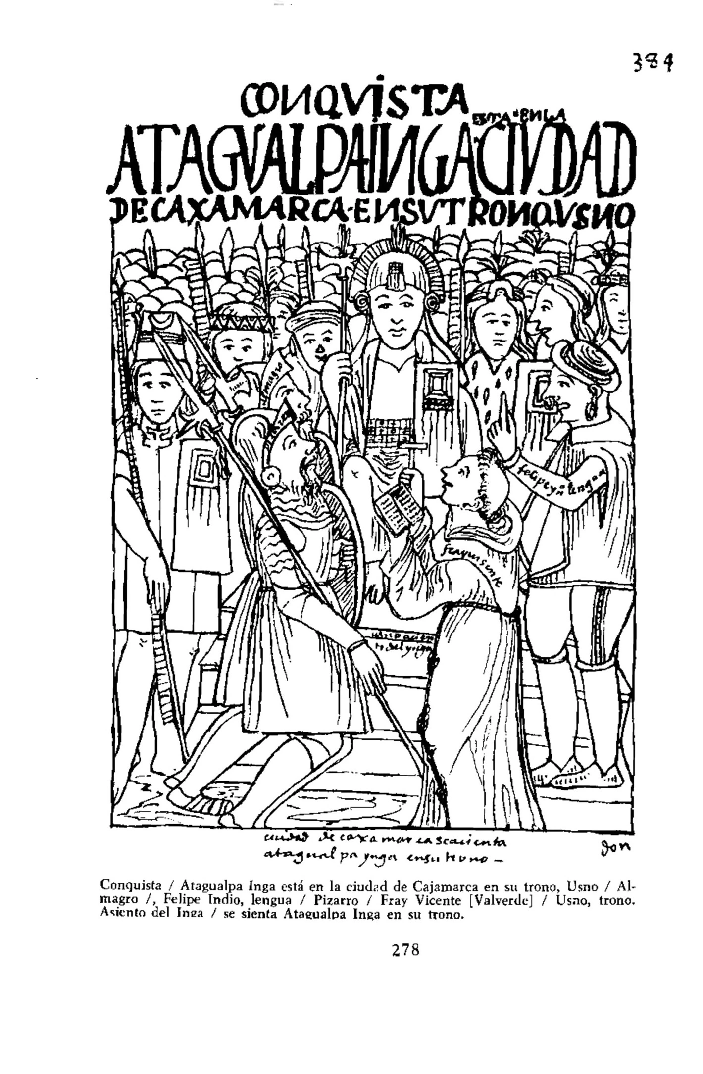 El cura Fray Vicente Valverde se adelanta para llevar cabo el requerimiento. Lleva una Biblia.