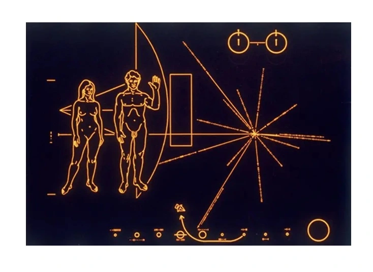 Una de la imágenes centrales era una pareja humana. Imaginando un destinatario que nada sabría de nosotros, quisieron dar a entender que entre hombre y mujer hay una relación. Así, pensaron entonces mostrarlos tomados de la mano, pero alguien objetó que eso podría llevar a los transestelares a una confusión. Podrían pensar que se trataba de un solo ser y no de dos. Por eso resolvieron separarlos, y que apareciera el hombre levantando la mano en señal de saludo.